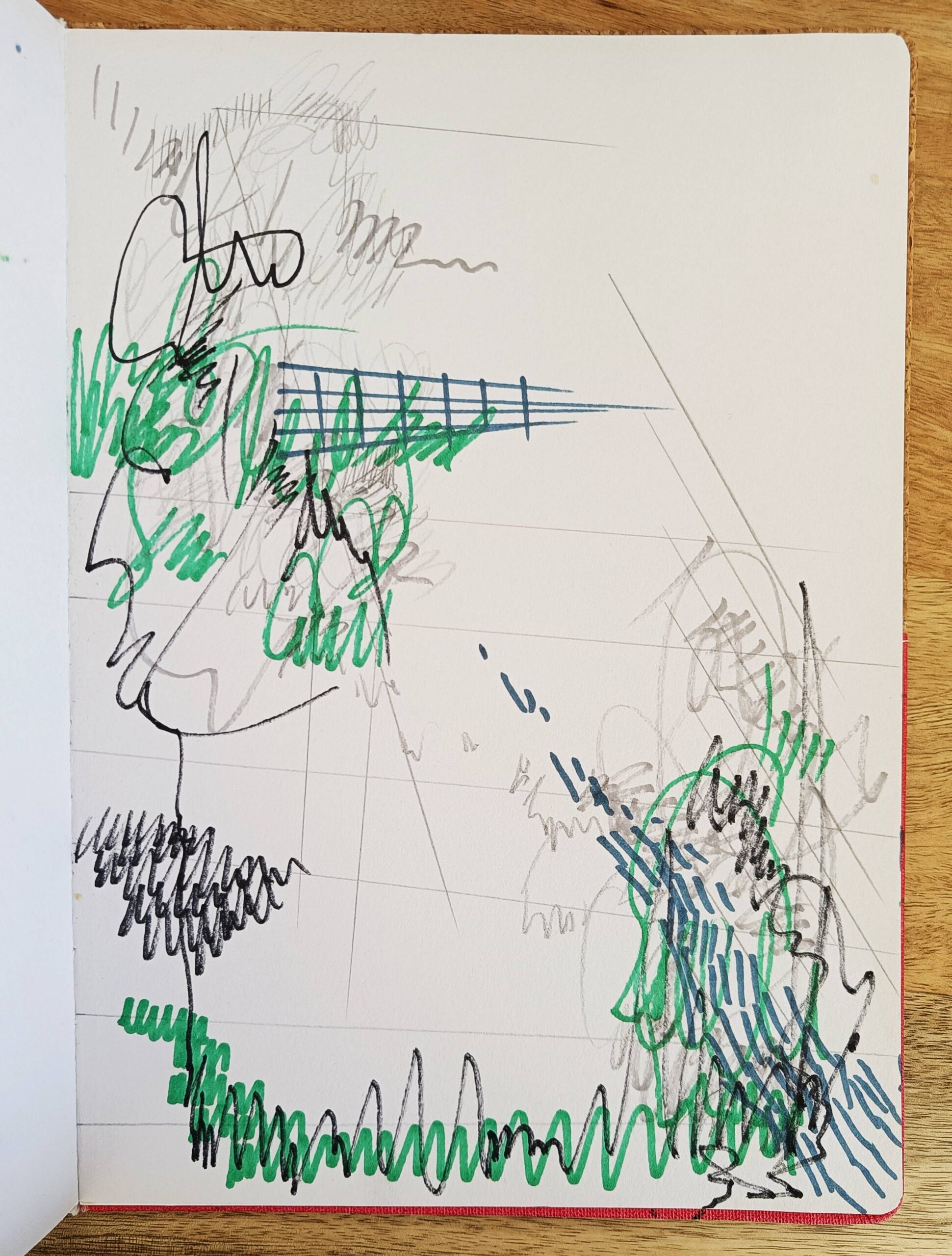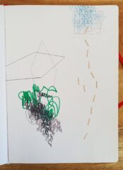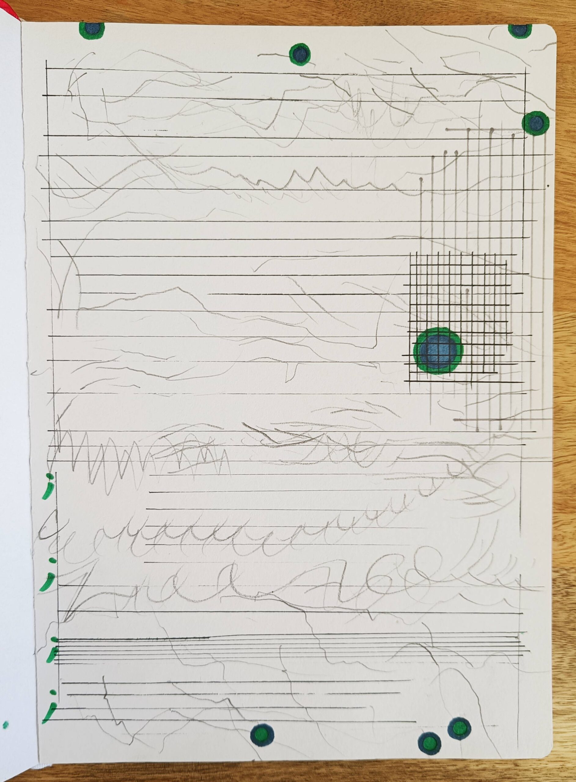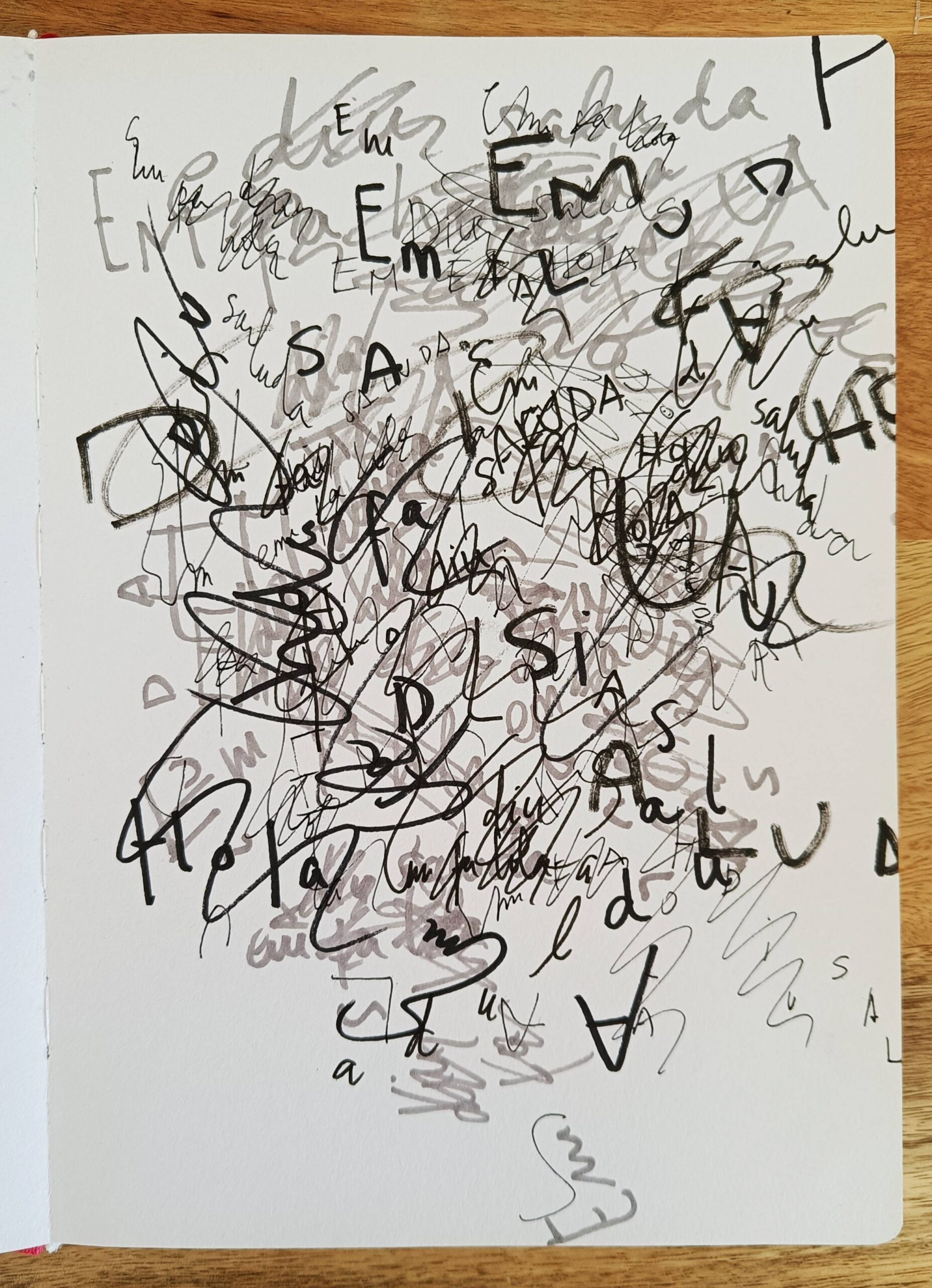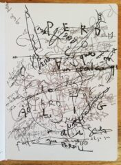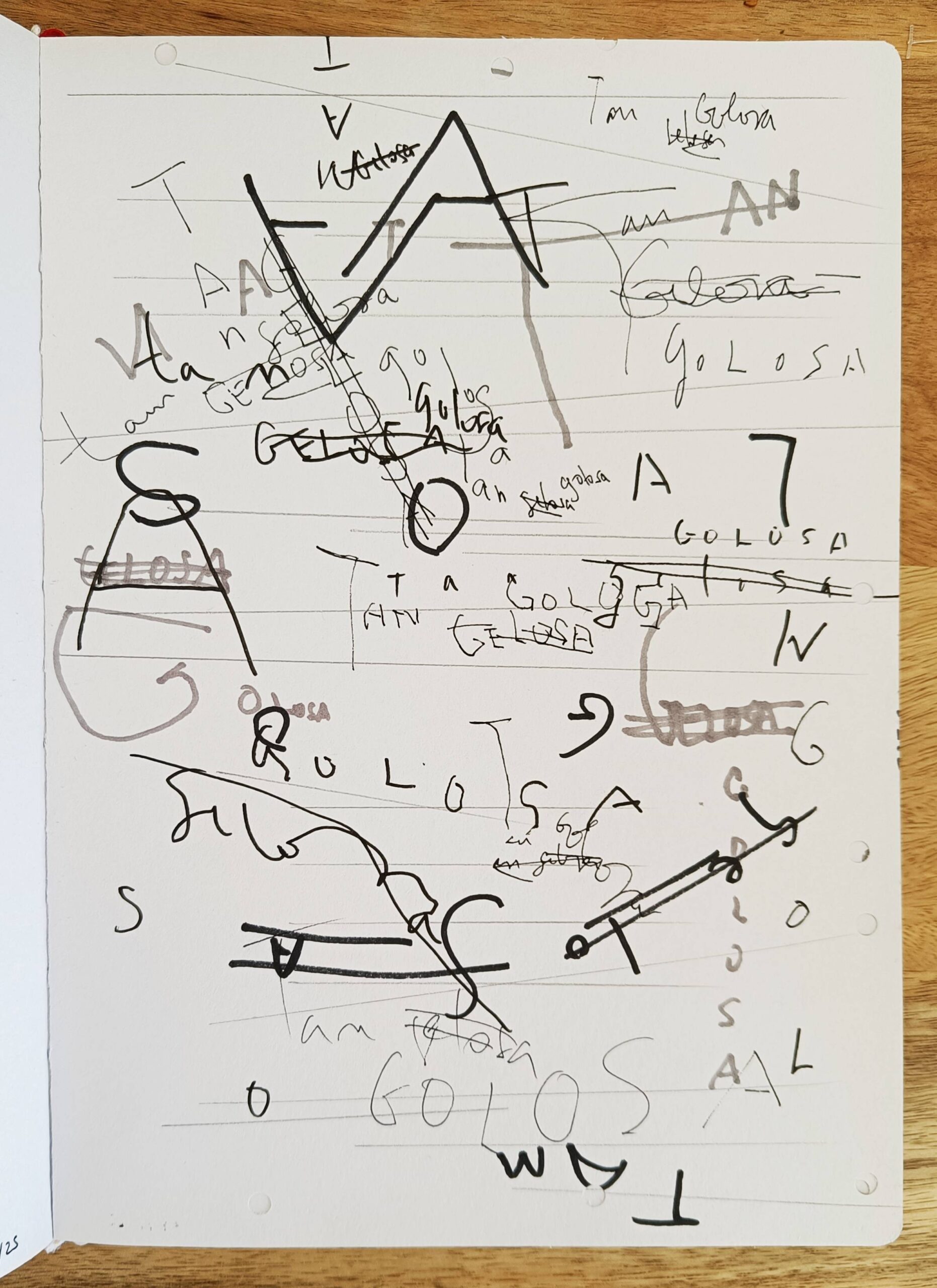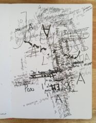 Peça en format quadern que explora maneres diverses aproximar-se a allò que Roland Barthes anomena “grau 0 del llenguatge”, allò que precedeix, d’alguna manera, al llenguatge que fem servir en la comunicació quotidiana; llenguatge estructurat, pràctic, útil. S’exploren recursos expressius com ara el gest d’escriure, el grafisme (línies, punts, comes…), la composició, la seqüencialitat, la sobreposició de capes, el collage o la propia materialitat d’elements comuns en l’edició o l’univers gràfic, com ara les grapes, la perforadora o el segell. D’altres materials predominants son el rotulador, punta-fina i llapis. El resultat final és una mena de quadern d’artista que es mou en una intersecció entre les arts plàstiques i l’escriptura.